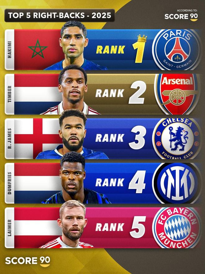 Score90评2025年五大后卫:加布里埃尔+巴黎双边卫居首